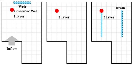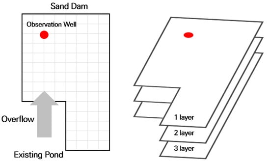 In order to simulate the flow of groundwater in the sand dam and the amount of discharge through perforated drainage pipes in the 3rd layer and weir in 1st layer, it was divided into a grid of 1 m × 1 m in the horizontal and vertical directions as shown in Figure 7. Red dot means observation well.