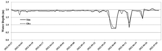 As shown in Figure 8, it can be seen that the simulated water level fits the observed level well. During the valve shut-off period, the water level is maintained at a value slightly above about 1.9 m, and the water level fluctuates according to the amount of inflow into the sand dam and the amount of discharge from the drain pipe after the valve was opened on 16 May 2022.