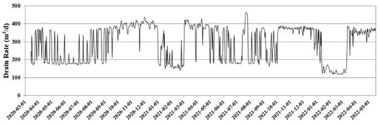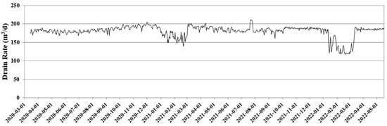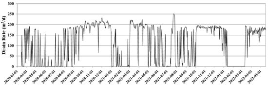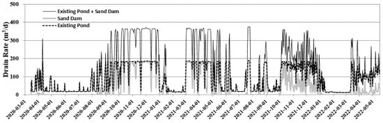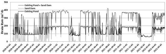 For the existing water intake source, the discharge amount of the continuous drain pipe was calculated by multiplying the water level automatically observed every hour from 9 March 2020 by the drainage conductance. Figure 9 shows the discharge amount of the existing water intake for the period immediately before the operation of the new sand dam from the time when the existing water intake was observed. It can be seen that the discharge amount decreased due to the decrease in water level in the winter in January and February, and it ranges from a minimum of 117.5 m3/day to a maximum of 210.4 m3/day. During the analysis period, an average of 179.9 m3/day of water is supplied through the existing water intake source.
