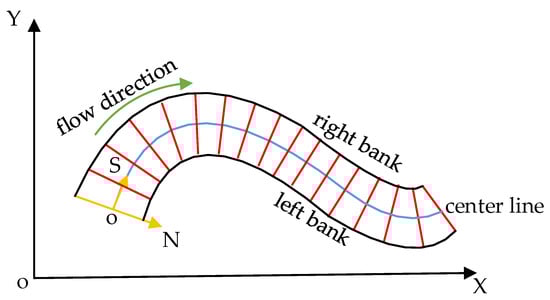 As the meandering, curvature, and flow directions change, the topographic characteristics of the river often create challenges when analyzing river data. For example, most geographic information system (GIS) software packages with interpolation tools are only applicable to Cartesian coordinates (x, y), resulting in much inconvenience when judging the spatial data on the left and right banks, and upstream and downstream of the river. Therefore, taking the river center line as the spatial reference is a necessary procedure for data preprocessing. The reference system is the S axis, which runs along the flow direction; the N axis runs across the flow direction and is perpendicular to the S axis []. Previous studies introduced GIS programs or mathematical algorithms that use “straightening” programs to convert regular Cartesian (x, y) systems into channel-centered (s, n) coordinate systems. This paper draws on the spatial reference location method designed by Merwade. The upstream and downstream relationship of the section is judged by the S axis, and the left and right banks of the spatial point are judged by the N axis. The starting point of S is the upstream source of the river. Looking upstream along the S axis, the left bank is on the left, and the right bank is on the right. The spatial reference is shown in Figure 1.