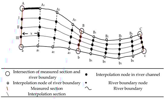 First, the intersection node is determined between the measured section, and river boundaries A, a, B, b, as shown in Figure 2. The node’s coordinate position (such as A1, A2, and A3 in Figure 2) on the boundary of the interpolated section is calculated according to the boundary node of the adjacent section and the longitudinal spacing distance (such as x in Figure 2) or the equal proportion of the interpolated section. The following method was used for node coding and identification: ArcGIS was used to take nodes at equal intervals between the left and right bank boundaries of the river (spacing set to 1 m) and to code each node. Through node traversal, the node closest to the measured section was identified. This node was very close to the intersection and was in the approximate location of the intersection. The boundary file included two node coordinate files on the left and right banks. The measured points on the section needed to be compiled according to the rules from upstream to downstream and from the left bank to the right bank. As shown in Figure 2, the left and right banks of the river were A, B, and C; and a, b, and c, respectively. The measured sections were A–A, B–B, and C–C. The new interpolated transverse sections were A1, A2, A2, etc. The new interpolated longitudinal sections were I, II, and III.