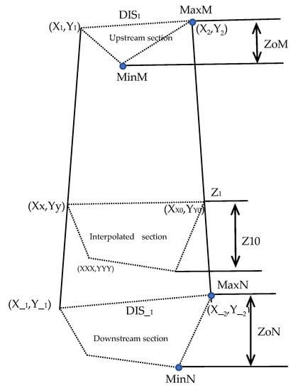 The highest points MaxM and MaxN, lowest points MinM and MinN, and height differences ZoM and ZoN of the upstream and downstream section nodes were first obtained. Second, the elevation Z1 of the highest point and height difference Z10 between the highest and lowest points were obtained according to the position ratio RAT of the upstream and downstream sections where the interpolation section was located. Lastly, the elevation Z_1 of the interpolation node was obtained by subtracting the height difference Z10 of the scaled corresponding vertices of the upstream or downstream sections from the elevation Z1 of the highest point of the interpolation section. ZM is the vertex elevation of the known upstream (downstream) section. The calculation formula is as follows: