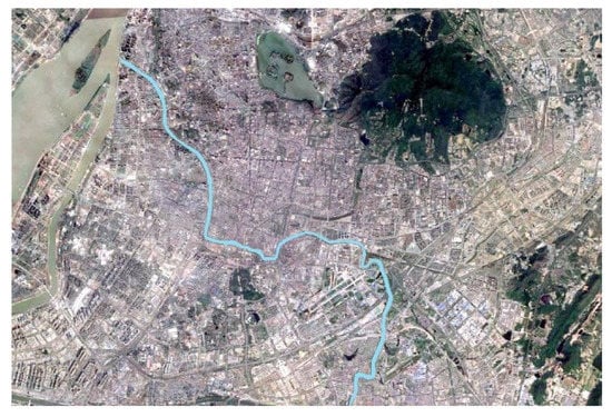 Qinhuai River (Figure 6) is located at 31°35′–32°07′ N and 118°43′–119°18′ E. It is a branch river on the south bank of the lower reaches of the Yangtze River. There is a sluice at Wuding gate, and the average flow, as monitored for many years, is 15 cubic meters per second. In order to study the impact of sewage discharge from the riverside sewage treatment plant on the water quality of the downstream monitoring section, it is proposed that a two-dimensional hydrodynamic water quality model be established for prediction. The spatial data in this experiment adopted the three-degree Gauss Kruger projection with a central longitude of 120 degrees, and the original positioning frame was the CGCS2000 coordinate system.