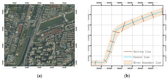 Section position. (a) Image map; (b) river boundary: center line and section lines.