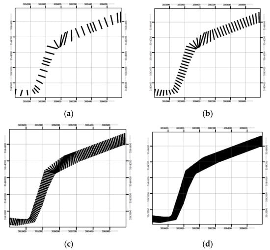 According to the two-step method, the topographic data of six measured sections were initially encrypted. In order to compare the interpolation effects of different densities, the interpolation intervals of the transverse sections were set to 80, 40, 20, and 10 m. The equidistant interpolation nodes of the river boundary between two adjacent measured sections can be calculated to determine section lines A1, a1, etc. The number of longitudinal sections was set to n = 5, and the corresponding equidistant nodes were calculated, which were in the river channel along the interpolated section line. After the horizontal position of the preliminary densification point had been calculated, according to the river bottom elevation of the measured section, the overall linear weight method proposed in Article 2.2 was used to calculate the river bottom elevation value of the node in the river between two adjacent measured sections, and multiple groups of river bottom elevations were obtained (Figure 8).