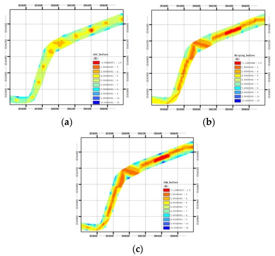 Interpolation results directly using (a) RBF, (b) Kriging, and (c) IDW without preliminary encryption under CGCS2000 coordinate system.