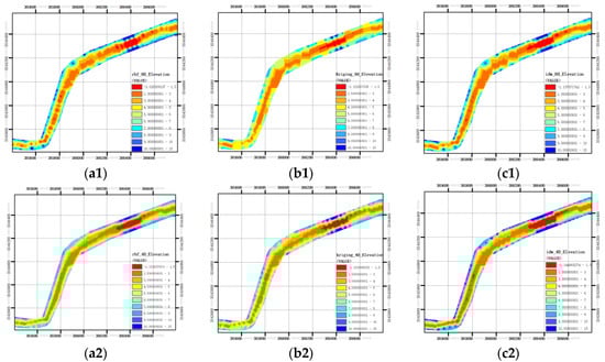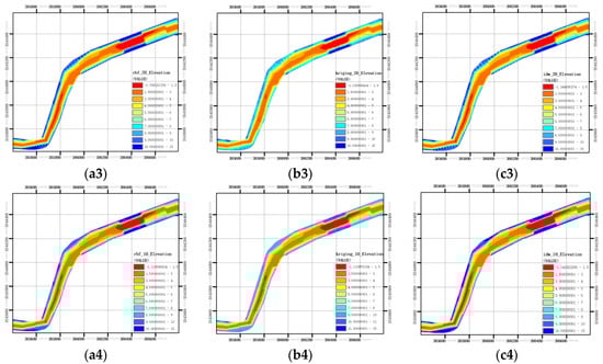 Two-step interpolation results after preliminary encryption at different transverse spacing and further interpolation with RBF, Kriging, and IDW under CGCS2000 coordinate system. (a1,b1,c1) Transverse spacing of 80 m; (a2,b2,c2): 40 m as transverse spacing; (a3,b3,c3) 20 m as transverse spacing; (a4,b4,c4) transverse spacing of 10 m; (a1–a4) RBF as a further interpolation method; (b1–b4): Kriging as a further interpolation method; (c1–c4): IDW as a further interpolation method.