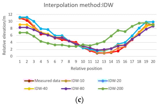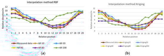 In order to more intuitively observe the impact of the encryption interval on the simulation results, as shown in Figure 11, any section could be randomly selected for observation. By comparing the measured values of 20 sampling points on the section and the calculation results of further interpolation under the different encryption intervals, no matter which interpolation method was used during the later stages, the smaller the encryption interval in the earlier stage was, the closer the final simulation result was to the actual terrain. If RBF, Kriging, or IDW were directly used to interpolate the sampled point data without initial encryption processing, the simulated elevation error value could be up to 5 m or even more.
