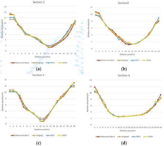 In this paper, four groups of measured section data (as shown in Figure 12, Sections 1–4) were used to analyze and test the influence of different local interpolation methods on the accuracy of the generated river terrain when the section spacing is 10 m. Figure 12 shows that the simulation results using the IDW interpolation method were better than those obtained when using RBF and Kriging for the four sections.