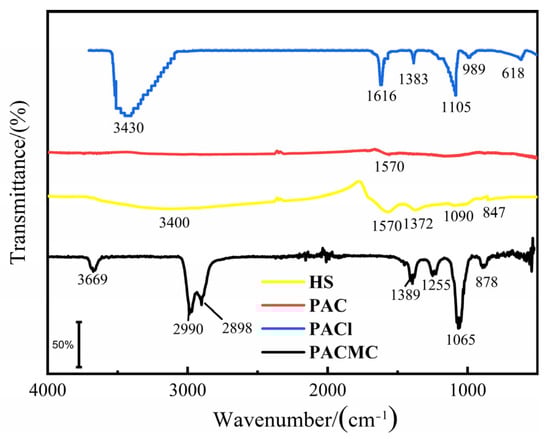 The FT-IR spectra for PACl, PAC, HS, and PACMC were recorded and are shown in Figure 1. In the case of PACl, the bands appearing at 3430 cm−1, 1616 cm−1, and 1383 cm−1 are associated with OH vibrations. The bands at 1105 cm−1 and 989 cm−1 are assigned to the bending vibrations of Al-OH2 and the band at 618 cm−1 is assigned to the symmetric stretching mode of Al–O bond of the central AlO4− [30]. In the case of PAC, 1570 cm−1 were related to the aliphatic C=O (-COOH, -COOR) [31,32,33]. In the case of HS, the most interesting bands, in which oxygen-containing functional groups carboxylic and phenolic may be observed, are 1570, 1090, 1372, and 3120 cm−1 [34]. In the case of PACMC, the peaks located at 1065 and 2990 cm−1 meant the stretching vibration of C-O and RNH and RNH2, respectively [31,32,33]. After PACMC synthesis, FTIR study was performed to identify the functional group in PACMC. As seen, new peaks appeared in the FT-IR spectrum. It can be observed that the major changes of PACMC IR spectra occur at the region 3700–1000 cm−1, in which the adsorption bands of oxo-groups or oxo-bridges appear. Specifically, the band at 3430 and 3120 cm−1 in PACl and HS spectra gradually degenerates into three distinct bands at 3669, 2990, and 2898 cm−1. In this region, bands related with the vibrations of C-C and C-O bonds appear. The band at 1105 cm−1 in the PACl spectra gradually degenerates into two distinct bands at 1065 and 1255 cm−1 after the PAC and HS addition. The alteration of bands indicates that PACl, PAC, and HS molecules are all affected by the combination of three compounds. Moreover, at the region 1000–600 cm−1, the two weak bands appearing at the spectra of PACl gradually disappear. At the region 1700–1500 cm−1, the three weak bands appearing at the spectra of PACl, PAC, and HS gradually disappear. These bands are associated with vibrations of oxo-groups or oxo-bridges and the disappearance could be an indication of interaction among PACl, PAC, and HS molecules.