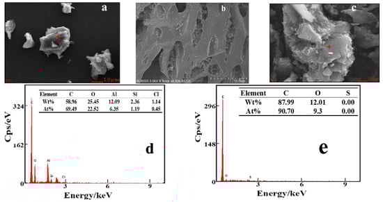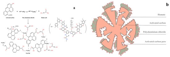 SEM images of PACMC at different magnifications are given in Figure 2a,b. The availability of pores and internal surface is clearly displayed in the SEM picture of PACMC. It was possible to observe that PACMC was constituted of different size particles. PACMC has a layered structure, irregular shape, and the surface is fractured and rough. Furthermore, the surface of these particles has a lot of tiny pores, cracks, and attachs fine particles, which forms a complex pore network system. The micrographs reveal that PAC presents a layered surface, which is also an indication that PAC provides supporting and channels for PACMC (Figure 2c). EDS images of PACMC are given in Figure 2d. Peaks of silicon, aluminum, and chlorine appear in PACMC, while the content of carbon decreases and the content of oxygen increases, indicating that PACMC has -OH and -COOH groups. PAC is mainly composed of carbon and oxygen (Figure 2e). By comparing Figure 2d and Figure 3b, it can be seen that silicon, aluminum, and chlorine do not appear on all surfaces, which indicates that PAC and PACl are unevenly distributed in the preparation process of PACMC. The preparation route and a schematic microstructure illustration of PACMC are speculated as shown in Figure 4.