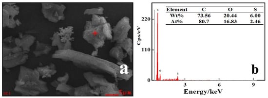 SEM and EDS maps of PACMC after RhB adsorption. (a) PACMC-SEM; (b) PACMC-EDS.
