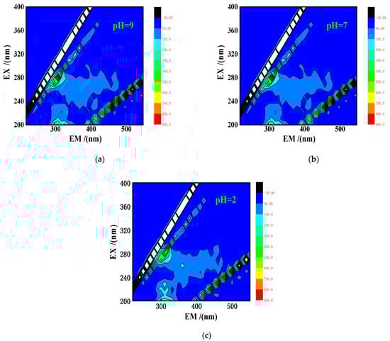 EEMs maps of PACMC’s supernatant at different pH conditions (a) pH = 9. (b) pH = 7. (c) pH = 2.