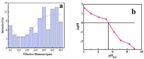 The specific surface area (10.098 m2·g−1) and average particle size (142.9 µm) of PACMC and the specific surface area (710.1 m2·g−1) and average particle size (11.9 µm) of PAC were measured. By comparison, it can be seen that PACMC has a larger average particle size, which is conducive to solid–liquid separation. PACMC will have a better adsorption effect on hydrophilic small molecular because it has a more active functional group. As shown in Figure 6a, the particle size distribution of PACMC shows that the particle size of the material ranges from tens of microns to hundreds of microns, compared with PAC, which can achieve better solid–liquid separation and recycling effect. Studies have shown that PACl flocculation effect is unstable [35], indicating that the introduction of HS promotes the bonding of PAC particles, and PACl reacts with PAC and HS during the reaction process, resulting in more compact particles than ordinary flocs. In addition to the influence of surface functional groups, the charge characteristic of particles is also an important factor to determine the adsorption effect of materials. The zero charge point (intersection of pH and ΔpH) of PACMC under different pH conditions was measured experimentally, as shown in Figure 6b. With the increase of pH, the charge on PACMC surface changed from positive to negative (transition point pHpzc at pH = 5.4). In the adsorption experiment, the charge on PACMC surface is positively at pH below this and negatively at higher pH. Therefore, under different pH conditions, the interaction between PACMC and dye molecules should consider the changes of surface functional groups, electrical properties, and charge density at the same time, and the adsorption effect is the comprehensive embodiment of chemical and physical interaction.