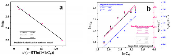 The adsorption data were analyzed and four different models were considered: Langmuir, Freundlich, Temkin, and Dubinin–Radushkevich isotherms, described by Equations (4)–(7). The validity of these models was verified by finding the equilibrium constants as well as the value of the square of the correlation coefficient (R2). A summary of the models’ results considered is presented in Figure 7a,b. The examination of the adsorption data obtained when Langmuir, Freundlich, and Temkin isotherm was applied shows relatively low values for R2 in the range of 0.84 to 0.89. Dubinin–Radushkevich isotherm was also examined to fit the data. The R2 value is high (R2 = 0.9930). A plot of lnqe vs. ε2 shows a linear relationship that allows the calculation of the constants qmax and E as described by Equation (7) and summarized in table and shown in Figure 7a. The good fitting of the adsorption data to Dubinin–Radushkevich isotherm suggests that the adsorption of RhB by PACMC may be physical adsorption or existing ion exchange. The β value can be used to predict the mean free energy (E (kJ)) as follows: