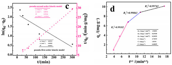where, k1 (min−1) is the adsorption rate constant of pseudo-first-order kinetic model; k2 (g·(mg·min)−1) is the adsorption rate constant of pseudo-second-order kinetic model; kdi (mg·(g·min0.5)−1) is the rate constant of internal diffusion model; c (mg·g−1) is a constant [28].