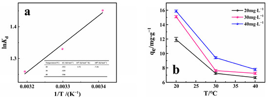 The direction and reaction degree of a physical and chemical process can be determined by thermodynamic study. Therefore, thermodynamic parameters of RhB adsorption by PACMC were calculated based on experimental data to explore the characteristics of the adsorption process. Figure 8a depicts the variation of lnKd with 1/T. The enthalpy of adsorption was determined from the slope of the straight line and to be equal to −7.36 kJ·mol−1. These thermodynamic functions at different temperatures are calculated and shown in Figure 8a. The positive value of entropy (ΔS) and the negative value of Gibbs free energy indicate that the adsorption process is spontaneous. The negative enthalpy indicates that RhB adsorption on PACMC is an exothermic process. This conclusion was also confirmed by Figure 8b. The uptake, particularly at a relatively high initial concentration (40 mg·L−1), indicated a decline upon increasing the temperature. The change in entropy (ΔS) and Gibbs free energy were found to be 1.72 kJ·(mol·K)−1 and −546 kJ·mol−1, respectively. The entropy (ΔS) values indicates that the confusion degree of the solid–liquid contact surface is increasing during the adsorption process. Both values show that the adsorption process is spontaneous [43].