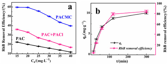 As shown in Figure 9a, when the initial concentration of RhB solution is 35 mg·L−1, under the same adsorption conditions, PACMC shows the maximum of RhB adsorption with 15.26 mg·g−1, which is 218% higher than PAC + PACl and 281% higher than PAC, respectively. The adsorption removal rates of RhB by PACMC, PAC + PACl and PAC all decrease with the increase of initial concentration of RhB solution, which is consistent with the law of adsorption. Constant adsorption capacity and dynamic adsorption equilibrium process determine the final adsorption ratio [44]. The introduction of PAC makes the pore structure of PACMC richer and helps to improve the adsorption capacity of PACMC. The adsorption capacity of PACMC for RhB is positively correlated with the effective adsorption sites on its surface, but the higher the initial concentration of RhB, the less effective adsorption sites of PACMC, so the removal rate of RhB is related to the initial concentration of RhB solution [45]. As the initial concentration of RhB increases, the adsorption capacity increases until the adsorption process reaches saturation, because the increase of RhB concentration strengthens the interaction frequency between PACMC and RhB. It is worth noting that with the increase of the initial concentration of RhB, its adsorption removal rate shows a nonlinear change, indicating that the removal of RhB not only includes the adsorption of the outer active site of the material, but also includes the internal diffusion process, and RhB has a stronger force with the small pore size in the material [46].