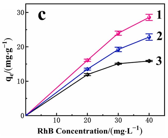 (a) Influence of initial RhB concentration for removal efficiency of RhB on PAC, PAC+PACl, and PACMC (Adsorbent mass: 1 g·L−1, Temperature: 20 °C, pH = 6.88, Reaction time: 24 h); (b) Influence of reaction time for the adsorption capacity (qt) and removal efficiency of RhB on PACMC (C0 = 20 mg·L−1, Adsorbent mass: 1 g·L−1, Temperature: 20 °C, pH = 6.88); (c) Influence of solution pH for the adsorption of RhB on PACMC 1—pH = 4.5; 2—pH = 9; 3—pH = 7 (C0 = 20, 30, 40 mg·L−1, Adsorbent mass: 1 g·L−1, Temperature: 20 °C, Reaction time: 24 h).