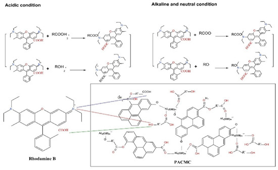 The SEM and EDS of PACMC after adsorption are shown in Figure 3a,b respectively. The layer structure that appears in Figure 2a gets blurred in Figure 3a because of adsorption. The particles are more dispersed and their morphology becomes more diverse, with floc-like substances appearing. The content of carbon increases and the content of oxygen decreases, indicating that they have adsorbed RhB (Figure 3b). The sulfur element appeared in element analysis may come from RhB impurity. The FT-IR of PACMC after adsorption is shown in Figure 10. As seen, new peaks appeared in the FT-IR spectrum. It can be observed that the major changes of PACMC IR spectra occur at the region 1600–800 cm−1, in which the adsorption bands of oxo-groups or bridges appear. Specifically, the band at 1390 cm−1 in PACMC spectra gradually degenerates into two distinct bands at 1400 and 1327 cm−1. In this region, bands related with the vibrations of O-H bonds appear. The band at 1050 cm−1 in PACMC spectra gradually degenerates into two distinct bands at 1174 and 1125 cm−1. Moreover, the band at 890 cm−1 in PACMC spectra disappears. The alteration of bands indicates that the carboxylic hydroxyl group disappeared and the hydroxyl group decreased after the adsorption of RhB by PACMC, indicating that carboxylic and hydroxyl groups are involved in the reaction during the adsorption process. FT-IR results before and after adsorption showed that the composition and structure of the adsorbent did not change, and the surfactant functional groups were basically consumed. At the same time, the particle dispersion increased after adsorption, indicating that part of the active functional groups that play the role of bridging were also consumed. On account of all the experimental results above, the functional groups (-OH and -COOH) that introduce on the surface of PACMC will chemically bond with RhB. The adsorption mechanism of RhB by PACMC is as follows: under acidic conditions, due to hydrophobicity, RhB+ is more likely to contact with PACMC, resulting in chemical bond bonding, and there is electrostatic attraction between positively charged PACMC and RhB. Under alkaline conditions, there is charge attraction between negative charged PACMC and RhB+. However, the formed complex RhB±(OH-)n tends to be repelled by the PACMC surface, decreasing the Qm values. The mechanism is speculated as shown in Figure 11.