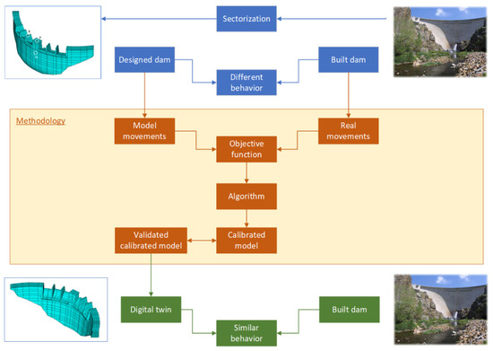 The objective of this first phase of the research was to define a methodology that allowed the development of a calibrated and validated numerical model of a concrete dam, with the necessary accuracy to be useful. Then, this model served as a digital twin of the real construction.