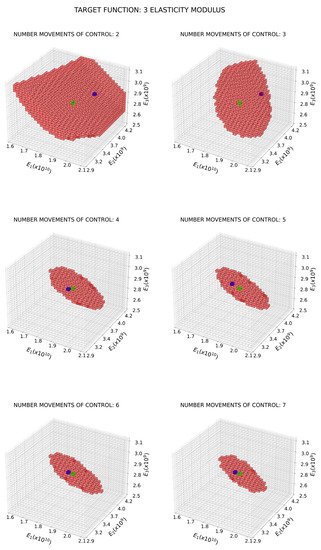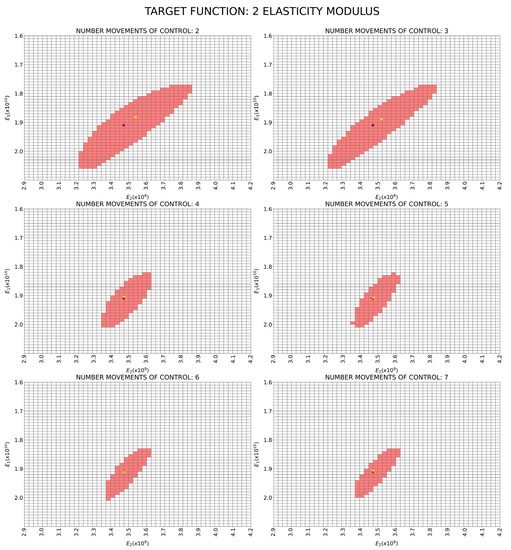 The number of radial movements available for calibration of a numerical model is variable in a real dam. For research purposes, from one to seven radial movements were considered in the optimization process. Therefore, the optimization method was run seven times, progressively including one to seven control movements. The objective function—that is, the mean error—as a difference between the real values of the dam movements and the calculated ones, was obtained for all points in the potential solution domain. In Figure 6, those points that meet the condition that the error is less than the maximum allowed value are represented in red. This red area is defined as the solution domain linked to a certain value of the maximum permitted error—in this case, one thousandth.