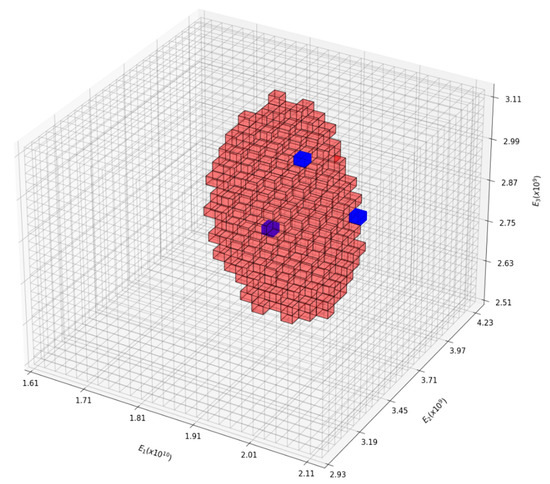 Sectorization 2 (3D). Number of control points: 3. E1, E2, and E3 are the moduli of elasticity of concrete and foundation, riverbed, and abutments, respectively (Pa). The SD is a 3D volume obtained when applying a grid search algorithm (red in the figure). Blue cubes correspond to the 6 × 6 × 6 exploration net (EN) and are inside the SD.