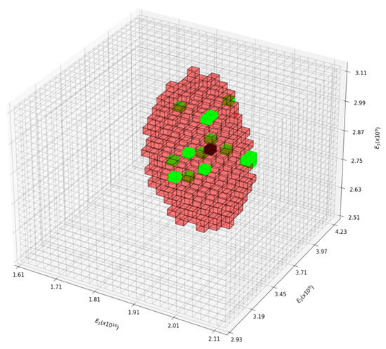 Sectorization 2 (3D). Number of control points: 3. E1, E2, and E3 are the moduli of elasticity of concrete and foundation, riverbed, and abutments, respectively (Pa). The SD is a 3D volume obtained when applying a grid search algorithm (red in the figure). Green cubes are the 18 points that approximate the SD boundary; the lighter colored ones are on the front face of the SD and the darker ones at the back face. The black cube is the centroid.