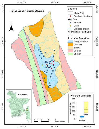 The aquifer was delineated based on data from six borehole logs from the Department of Public Health Engineering (DPHE) of Bangladesh (Figure 1 and Figure 2a). Based on the borehole logs, a very thick sandy aquifer dominates in the shallow subsurface ranging from 40 to 160 m, which is sometimes separated by a thin layer (20–45 m) of clayey deposits at variable depths (Figure 2b). There are two major aquifers present in the study area: the Plio-Pleistocene-aged Dupi Tila sandstone formation and the Pliocene-aged Tipam sandstone formation (Figure 1 and Figure 2b) [14,53]. Although recent valley alluvium covers the central part of the Khagrachhari Sadar region, both sand-dominated formations are exposed in other parts of the area (Figure 1). Moreover, the medium to fine-grained Dupi Tila aquifer and the fine to coarse-grained Tipam aquifer can both be found at shallow depths (Figure 2b); however, it is often difficult to distinguish these two aquifers [14]. At greater depths, interbeds of sandstone from the Bokabil or Bhuban formations may act as the deeper aquifer [14]. However, the DPHE boreholes collected data for up to 183 m of the subsurface, which results in a focus mainly on the shallow aquifers (Figure 2b).