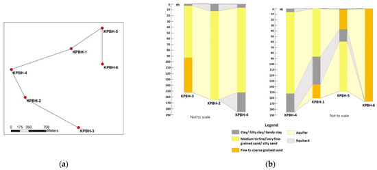 Delineation of aquifers based on the DPHE borehole logs: (a) cross-section line through the borehole locations shown in Figure 1; (b) two cross-sections showing the subsurface aquifers and local aquitard.