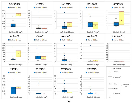 The box plots depict the statistical distributions of the concentration of different water quality constituents in shallow and deep wells, including major and trace ions, such as HCO3−, Cl−, SO42−, Na+, K+, Mg2+, Ca2+, NO3−, NO2−, PO43−, F−, Br−, Fe2+, and Mn2+ (Figure 3a). These plots provide a visual representation of the interquartile range, mean, median, and outliers, i.e., the occurrence of disproportionate concentration values for the constituents [55]. Water quality standards for each constituent [16,52] were also included in the plots to compare their concentrations against safe drinking water limits.