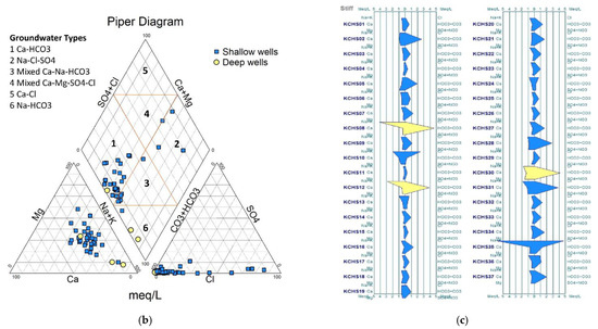 In Figure 3b, the plots of major ions from 37 wells show that water samples were dominated by the Ca–HCO3 and mixed Ca–Na–HCO3 types of groundwater, which are labeled as 1 and 3, respectively, in the diamond of the Piper plot [59]. Samples from two deep wells and four shallow wells contained Na–HCO3 and NaCl–SO4 types of water, respectively (Figure 3b).