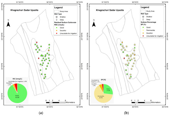 Spatial distribution of the measurements for (a) RSC and (b) SP in shallow and deep wells of the Khagrachhari Sadar for irrigation water quality assessment.