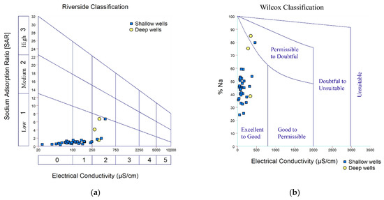 Groundwater suitability for irrigation can also be assessed using the Riverside classification [18] and the Wilcox classification [19], which are based on water salinity (electrical conductivity) vs. SAR value and sodium percentage (%Na) vs. electrical conductivity, respectively.