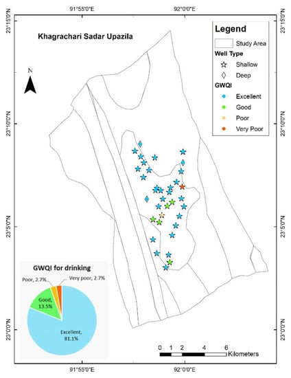 GWQI scores make it possible to categorize the suitability of groundwater for human consumption according to the following categories: excellent (<50), good (50–100), poor (101–200), very poor (201–300), and unsuitable for drinking purposes (>300) [24,33].