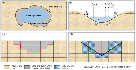 The SLM builds upon the numerical groundwater model MODFLOW. In the SLM, the maximum extent of the lake area is divided into a submerged area which is currently under water and an unsubmerged area which is currently above the lake water level (Figure 2a,b):