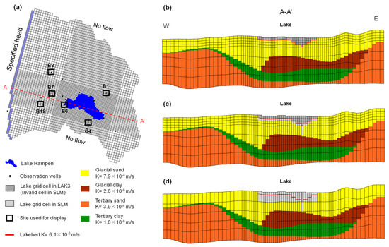 Configuration of the groundwater flow model and lake modules. (a) Plain view of the model domain: horizontal discretization, boundary conditions and observation wells. (b) Side view of the model domain at A–A′ for LAK3: vertical discretization, hydrogeological units and lake grid cells. (c,d) Side view of the model domain at A–A′ for the SLM: vertical discretization, hydrogeological units and grid cells with four layers (SLM-TS4) and one layer (SLM-TS1).