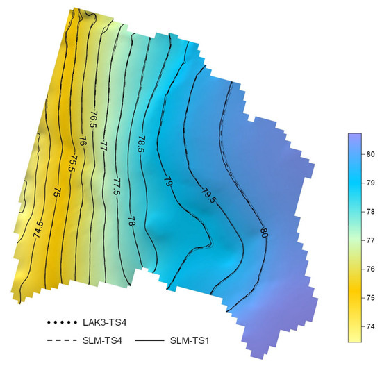 The annual mean simulated groundwater head in 2008 is shown in Figure 6. It is seen that the three models under scrutiny exhibit almost identical spatial patterns of simulated heads. The average difference is 0.0002 m between LAK3-TS4 and SLM-TS4. When reducing the number of calculation layers for the lake from four to one in the SLM, it does not generate any noticeable impact on the simulated results, as the average groundwater head difference is only 0.003 m between SLM-TS4 and SLM-TS1.