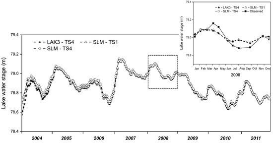 The observed and simulated lake water levels are shown in Figure 7. It is seen that all three models are able to reproduce the observed lake level in 2008 with acceptable accuracy. The SLM-based models (SLM-TS4 and SLM-TS1) have almost the same performance as the benchmark model (LAK3-TS4).