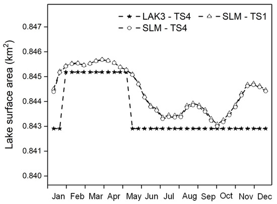 Figure 8 shows the simulated lake surface area of the three models in 2008. It can be seen that the simulated lake surface area based on the SLM changes smoothly, which resembles the lake’s natural condition more, while the lake surface area simulated by the LAK3 method can only be at certain fixed values because the lakebed within the lakebed cells is sloped in the SLM. In contrast, the lakebed is flat in LAK3. For instance, from February to April, the lake surface area simulated by the LAK3 method is 0.845 km2, while the SLM-based model increased the lake surface area from 0.845 km2 to 0.846 km2.