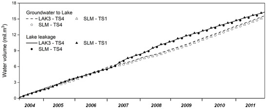 For Lake Hampen, it is mostly recharged by groundwater and precipitation, as shown in Table 3. The river inflow from upstream accounts for approximately 1/10 of the total lake recharge. It is shown in Table 2 and Table 3 that all three models can close the water balance rather successfully, with relatively small water balance errors. For groundwater, both the SLM-based models and LAK3 based-model have good performance (balance error of less than 0.1%). For the lake, the balance error for all three models is 0. Moreover, there is no significant difference in water balance performance when the number of lake layers is reduced from 4 to 1 in SLM, as shown in Table 2 and Table 3. The cumulative lake–groundwater interaction water volume simulated by the three models is shown in Figure 9. It can be seen that the simulation results of the three models are quite similar.
