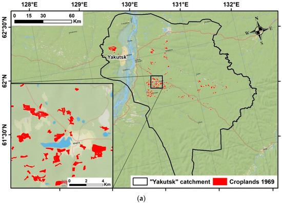 Maps of cropland allocation for two considering periods ((a): croplands 1969; (b): croplands 2021).