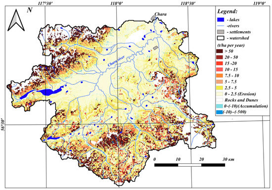 The maps of net erosion, which represent the erosion-accumulation budget of the studied areas, are an additional result of this work. Such maps were created for the period 1985–2019. The entire territory of the studied part of the catchment area of the Chara River is characterized by soil erosion losses of 1.72 t/ha per year in the period from 1986–2019. The gross soil erosion is about 17 t/ha per year. Soil erosion occurs within 96% of the Chara catchment area according to predicted data. Large erosion values in the catchment are generally located on steep slopes in the upper reaches of the Chara tributaries. The accumulation of part of the eroded material occurs in a small part of the study area (4%) at the foot of steep slopes, in river valleys within the dry valley, and is characterized by high rates, on average, up to −390 t/ha per year (Figure 6).