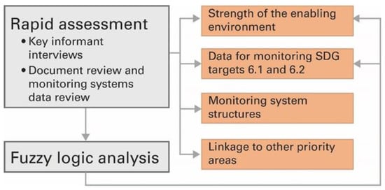 The United Nations Children’s Fund (UNICEF) and World Health Organisation (WHO) Joint Monitoring Programme (JMP) reports that only three African countries are on track to achieve universal access to at least basic water services by 2030 and only one country, Botswana, within the East and Southern Africa region (ESAR). Monitoring is crucial to advancing progress on SGD 6 in the region through providing reliable data to decision makers for policy, planning and much needed investment in the sector. This paper presents findings of the rapid assessment termed SDG 6 + 5 which relates to monitoring systems for Water Supply, Sanitation and Hygiene (WASH) in 21 countries of ESAR, five years into the SDGs. The paper presents the results of a fuzzy logic analysis applied to aspects and findings from the rapid assessment. Fuzzy logic benefits the study by managing unconscious bias from qualitative assessment and evaluating the strengths of countries’ WASH monitoring systems. The paper demonstrates similarities and variations between results from the rapid assessment and fuzzy analysis including Angola and Botswana scoring more favourably in enabling environments for monitoring from the analysis. The paper provides methods of rapid assessment of key aspects that impact on effective WASH monitoring and recommends the use of fuzzy logic to reduce data bias from qualitative methods. The methodology presented in the paper can be adapted and applied to other regions of the world and settings to enhance evaluations on the strength of systems within other sectors.