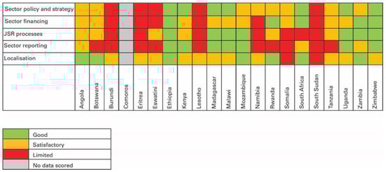Ten ESAR countries do not have annual reporting processes for WASH. Two countries report on some areas of WASH, albeit with gaps in reporting frequency and content. The study found that only eight ESAR countries have complete annually reporting processes. On localisation of SDG targets and indicators, most ESAR countries have national targets for SDG 6, except for two countries (Somalia and South Sudan) without national targets (Figure 3). This was largely corresponding with the findings of the 2019 Global Analysis and Assessment of Sanitation [5].