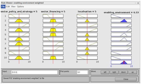 Fuzzy logic analysis was applied to two aspects (factors)—the enabling environment and data for monitoring SDG 6—with a fuzzy model developed for each aspect. For each factor, two to three priority elements from the rapid assessment were selected as sub-factors for the analysis. These sub-factors were applied as the input variables for the fuzzy modelling in MATLAB. Hence, the input variables of sector policy, sector financing for monitoring and localisation of SDG 6 were used to determine the output variable- strength of the enabling environment for WASH monitoring. Similarly, input variables of data availability and data alignment with SDGs were analysed for the output—quality of data for monitoring SDG6 (Figure 6).