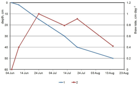 Depth (1) and seasonal soil thawing rate (2) in the Anadyr Lowland hummocky tundra.