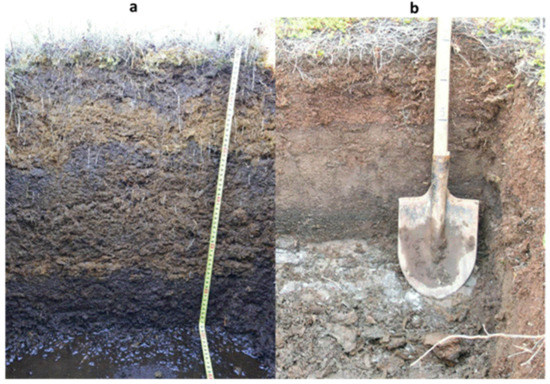 Profiles of (a) peat eutrophic cryogenic and (b) peaty-humic oligotrophic cryogenic soils.