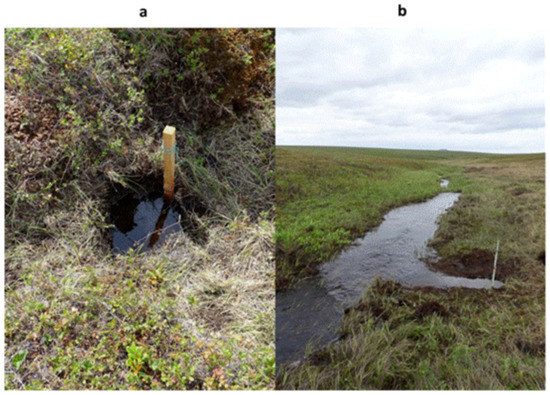 The peat deposits contained a peat soil horizon with a thickness of 25–30 cm and a 5–10 cm-thick wet peaty-humic horizon. These were underlain by a saturated, thick (up to 15 cm deep), dark-grey-colored sandy loam or loam layer. An additional level gauge was installed at a 30 cm depth into the channel of a lower tundra creek of the 1st order with a typical hummocky boggy catchment area of about 1.7 km2, and its water discharge on September 1 was 3.9 L/s. The creek banks and bed were incised into the peat stratum.