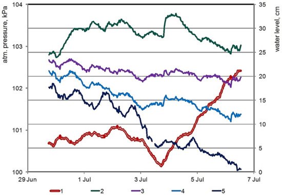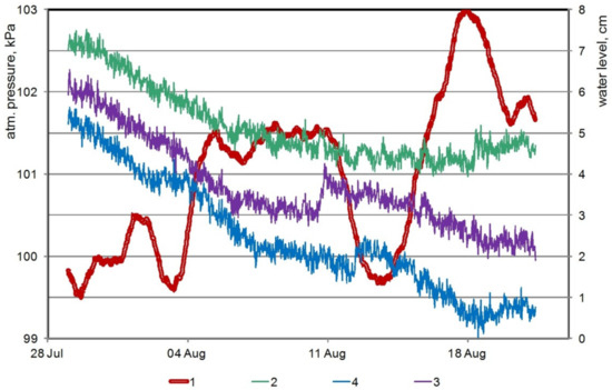 The measurement revealed an anomaly in WL variations on 2–3 July, which disagrees with subharmonic diurnal cycles (Figure 6). Thus, within 15 h, the WL in the pits and on the slope (No. 1 and 2) dropped almost simultaneously by 2.5–4.4 cm, after which it increased by 2.6–5.2 cm during the following 28 h. In the Yagodny Creek (the pit No. 3), similar WL variations were occurring almost synchronously with those described above—a drop by about 3.5 cm and the following rise by 3 cm. This simultaneous drop in the WL occurred against the background of their pronounced diurnal variations with an amplitude of about half of the drop and against the total day-to-day decreasing trend in the WL, most prominently in Yagodny Creek.
